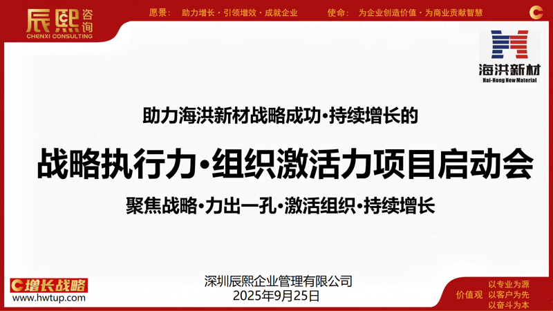2025年9月26日下午,河北海洪新材料有限公司会议室内气氛热烈,“助力海洪新材战略成功·持续增长的战略执行力·组织激活力项目启动会” 隆重举行。此次会议标志着河北海洪新材料有限公司与深圳辰熙企业管理咨询有限公司的战略合作正式拉开帷幕。