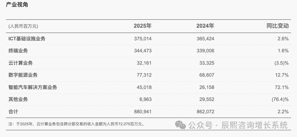 分业务看,华为ICT基础设施业务营收3750亿元,同比增长2.6%;终端业务营收3444亿元,同比增长1.6%;云计算业务营收321亿元,同比下滑3.5%;数字能源业务营收773亿元,同比增长12.7%;智能汽车解决方案业务营收450亿元,同比增长72.1%。